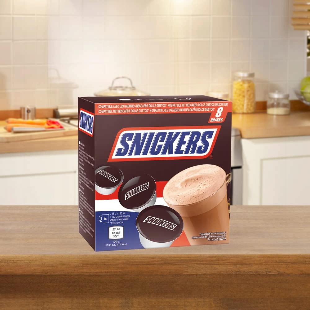 Marka Snickers od lat zachwyca unikalnym połączeniem czekolady, karmelu i orzechów. Teraz możesz cieszyć się tym smakiem w nowej, rozgrzewającej odsłonie. Dolce Gusto Snickers to doskonały wybór na słodką przerwę w ciągu dnia, energetyzujący poranek lub wyjątkową chwilę relaksu po ciężkim dniu.