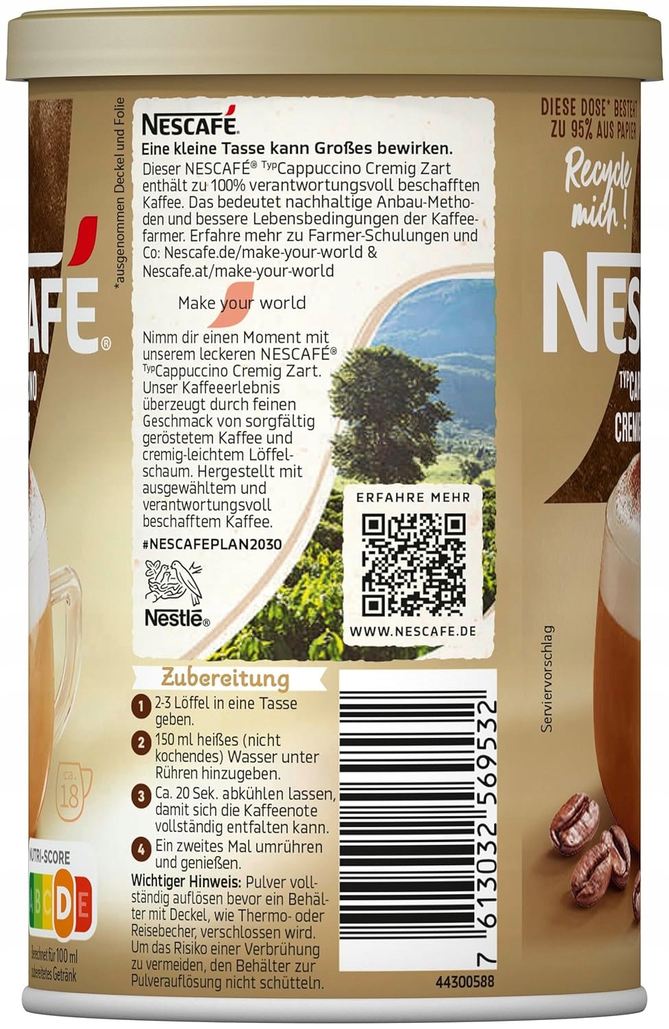 Spróbuj Nescafe Typ Cappuccino Cremig Zart i delektuj się idealnym cappuccino w każdej chwili. Dodaj do koszyka już teraz i ciesz się pyszną, mleczną kawą z puszystą pianką!
