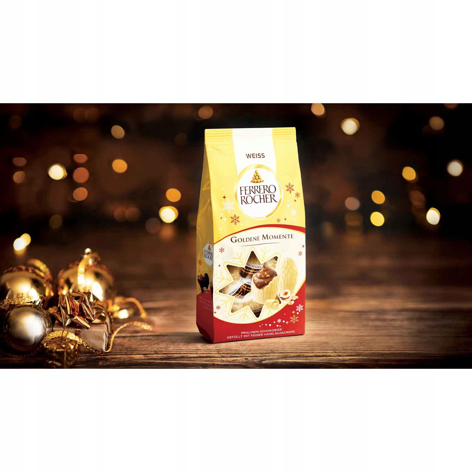 Spróbuj Ferrero Rocher Goldene Momente White i ciesz się unikalnym połączeniem białej czekolady, orzechów i chrupiącego wafelka. Dodaj do koszyka i rozkoszuj się złotymi momentami każdego dnia!