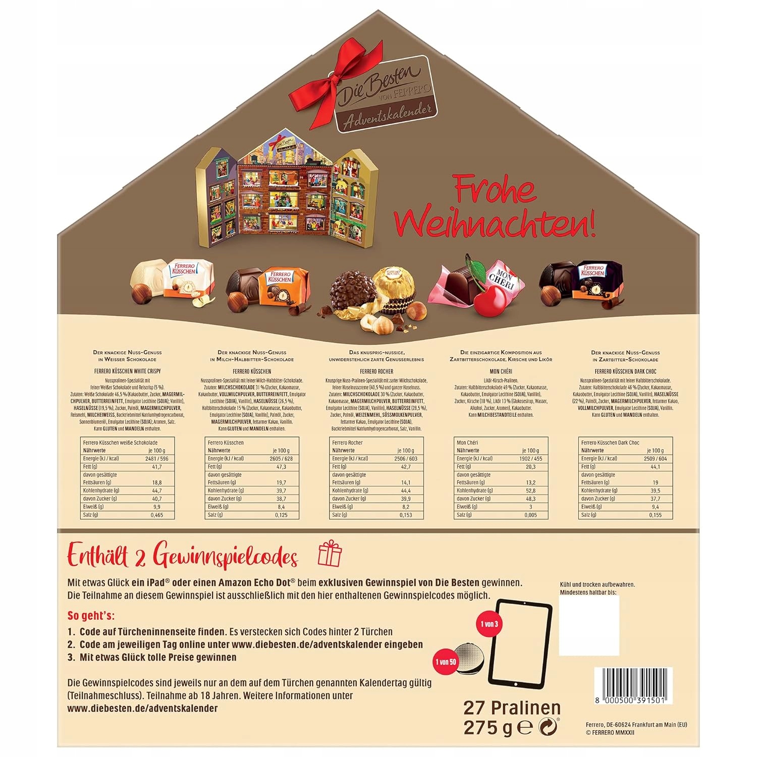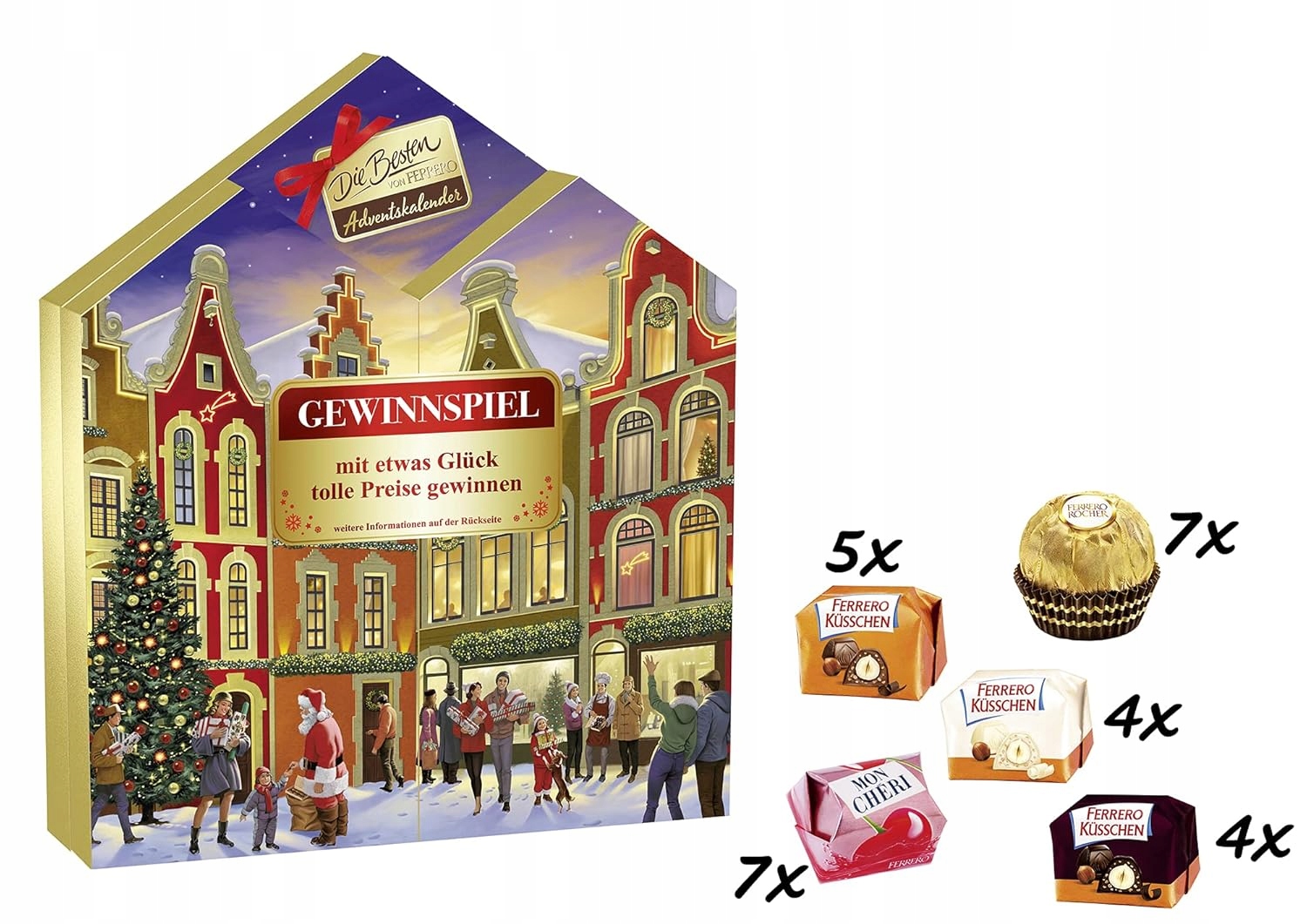W Kalendarzu Adwentowym Die Besten von Ferrero znajdziesz szeroki wybór kultowych słodyczy, takich jak Ferrero Rocher, Raffaello, Mon Chéri i inne czekoladowe przysmaki. Każde okienko kryje w sobie porcję luksusu, który sprawia, że codzienne chwile stają się bardziej wyjątkowe. Kalendarz Adwentowy Die Besten von Ferrero to idealny prezent dla bliskich lub sposób na dodanie odrobiny elegancji do przedświątecznego okresu.