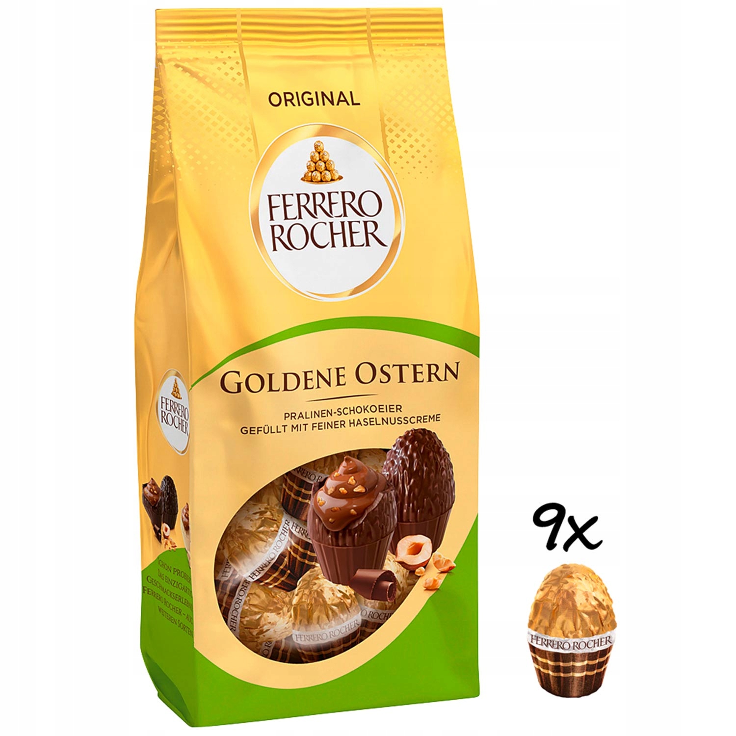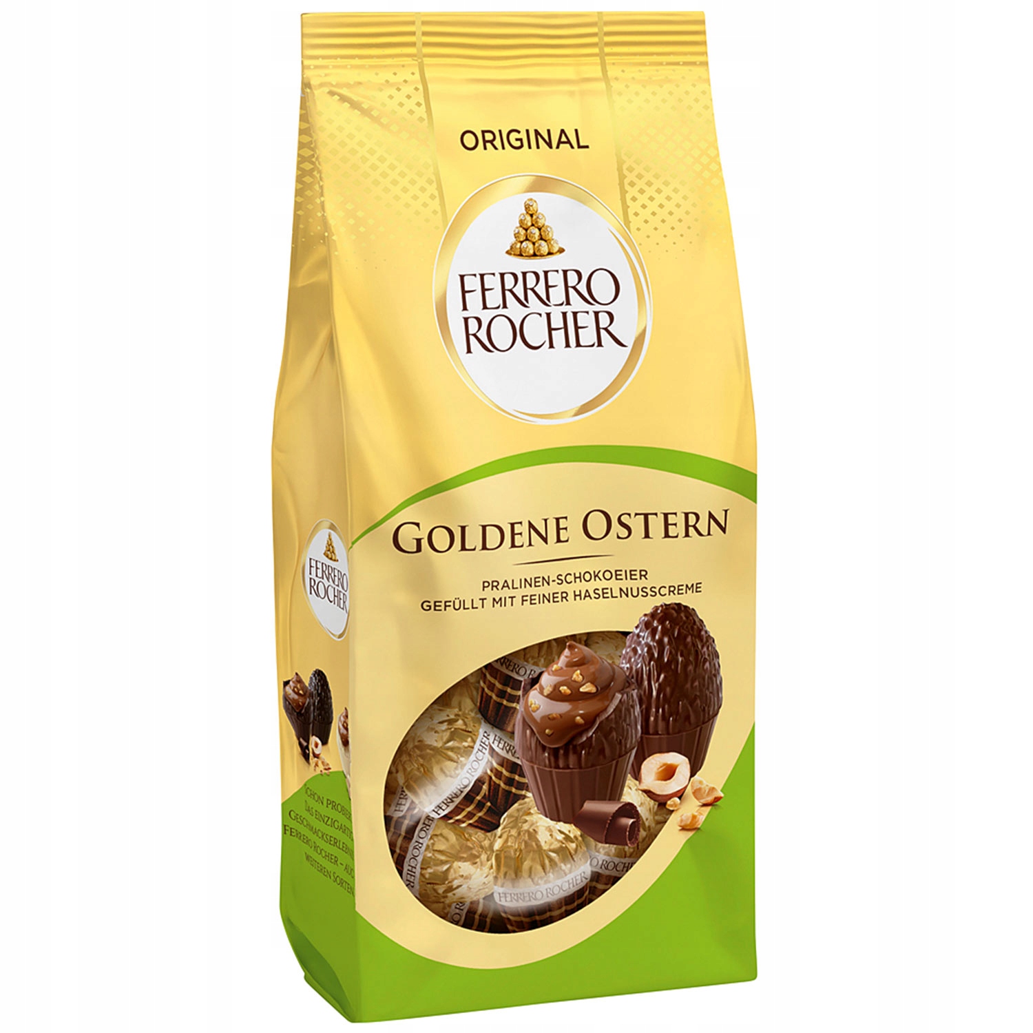 Ferrero Rocher Goldene Ostern Original 90g – wyjątkowe wielkanocne jajeczka, które łączą w sobie chrupiące orzechy laskowe, delikatną mleczną czekoladę oraz kruchy wafelek, tworząc niepowtarzalną teksturę i niezapomniany smak. W opakowaniu znajduje się około 9 sztuk jajeczek, co czyni je idealnym wyborem na Wielkanoc – jako dodatek do świątecznych koszyczków, elegancki upominek lub luksusowa przekąska na wielkanocnym stole.
