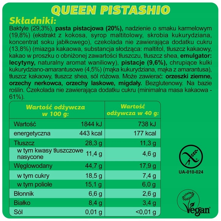 Fizi Guilty Pleasure Queen Pistachio to wyrafinowana przekąska stworzona z myślą o chwilach prawdziwej przyjemności. Już od pierwszego kęsa oferuje intensywne, deserowe doznania, które idealnie pasują do momentów relaksu i nagradzania siebie. Fizi Guilty Pleasure Queen Pistachio przyciąga eleganckim charakterem i smakiem inspirowanym klasycznymi słodkościami, dlatego doskonale sprawdza się jako mała przyjemność w ciągu dnia. To propozycja dla osób, które lubią świadomie wybierać wyjątkowe smaki.