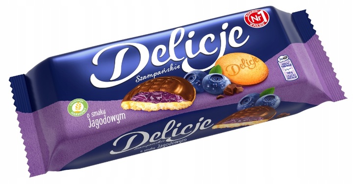 Delicje Szampańskie Jagodowe wyróżniają się lekką, biszkoptową strukturą oraz intensywną owocową nutą jagody. Delikatna galaretka wprowadza przyjemną świeżość, natomiast warstwa czekolady nadaje całości aksamitnej słodyczy. Dzięki temu Delicje Szampańskie Jagodowe oferują harmonijne połączenie smaków i tekstur w każdym kęsie. Dlatego Delicje Szampańskie Jagodowe świetnie sprawdzają się zarówno jako szybka przekąska, jak i słodki dodatek do deserów.