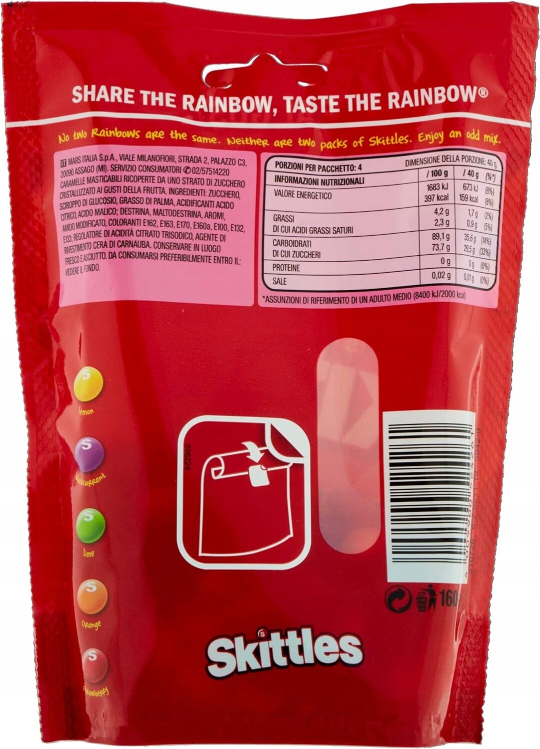 Skittles Fruits to idealny wybór na każdą okazję – spotkania z przyjaciółmi, imprezy czy jako słodki dodatek do codziennych chwil relaksu. Ich wyrazisty owocowy smak i charakterystyczna chrupkość sprawiają, że każdy kęs to czysta radość. Dzięki wygodnemu opakowaniu Skittles Fruits możesz zabrać je wszędzie ze sobą – do pracy, szkoły czy w podróż.