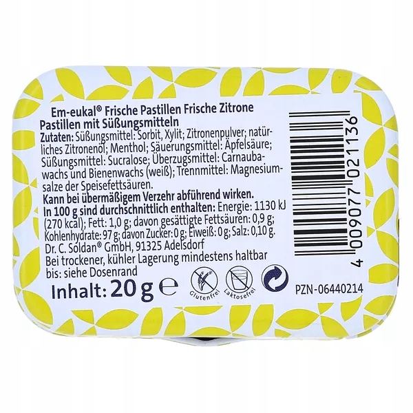 Spróbuj Em-eukal Pastylki Bez Cukru Cytrynowe i poczuj świeżość cytryny w każdej chwili. Dodaj do koszyka już teraz i ciesz się wyjątkowym smakiem Em-eukal Pastylki Bez Cukru Cytrynowe!