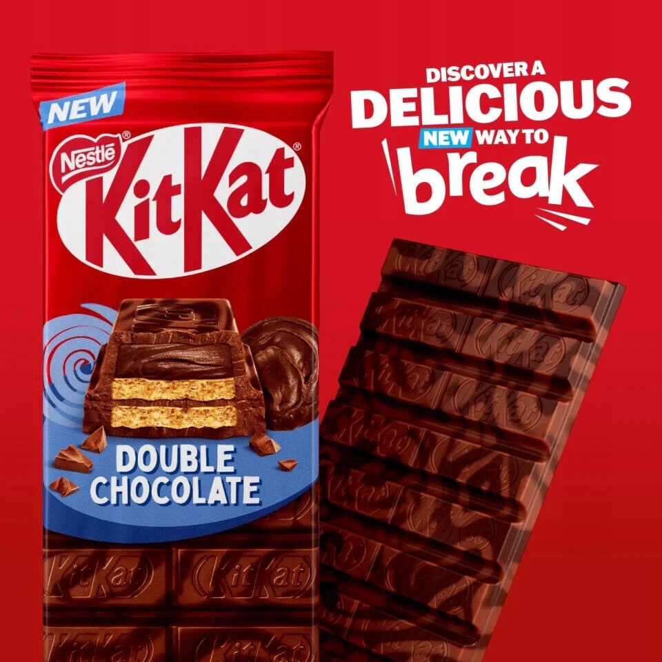 KitKat Double Chocolate Bar wyróżnia się wyraźnym, bogatym profilem smakowym. Każdy kęs łączy chrupkość wafla z miękkością kremu i delikatnością podwójnej polewy. To doskonały wybór na chwilę relaksu, deser po obiedzie lub szybką przerwę w ciągu dnia. Produkt doskonale sprawdza się także jako słodki dodatek do kawy lub prezent dla fana czekoladowych nowości.