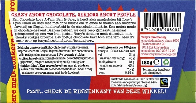 Tony’s Chocolonely Ben & Jerry’s Brownie zachwyca zbalansowaną teksturą, w której gęste, brownie-inspirowane nadzienie spotyka się z delikatną czekoladową otoczką. Całość tworzy przyjemnie kremową, ale jednocześnie bogatą w smaku kompozycję. Tony’s Chocolonely Ben & Jerry’s Brownie dostarcza kontrast między słodyczą a wyrazistością, idealny na każdą okazję. Każdy kęs to pełna, satysfakcjonująca porcja przyjemności.