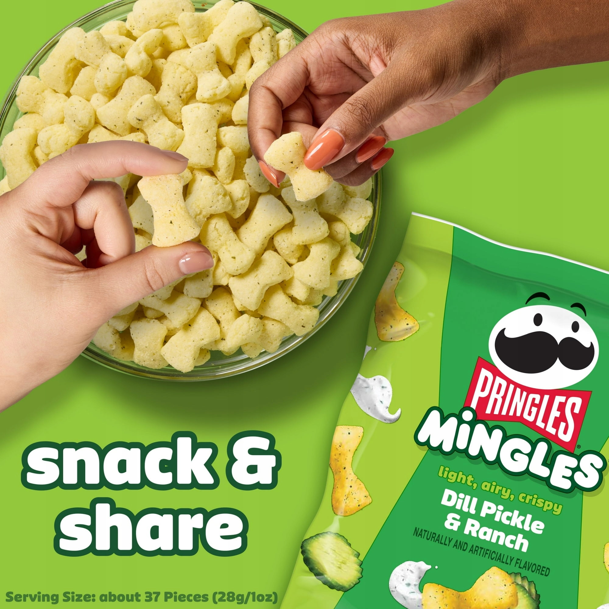 Pringles Mingles Dill Pickle & Ranch mają puszystą, a zarazem chrupiącą strukturę. Każda porcja łączy kwaskowaty, pikantny aromat ogórka z kremową łagodnością ranch. Dzięki tej kontrastowej kompozycji Pringles Mingles Dill Pickle & Ranch oferują wyjątkowe doznania. Niewielki kształt muszek sprawia, że idealnie nadają się do dzielenia i podjadania bez końca.