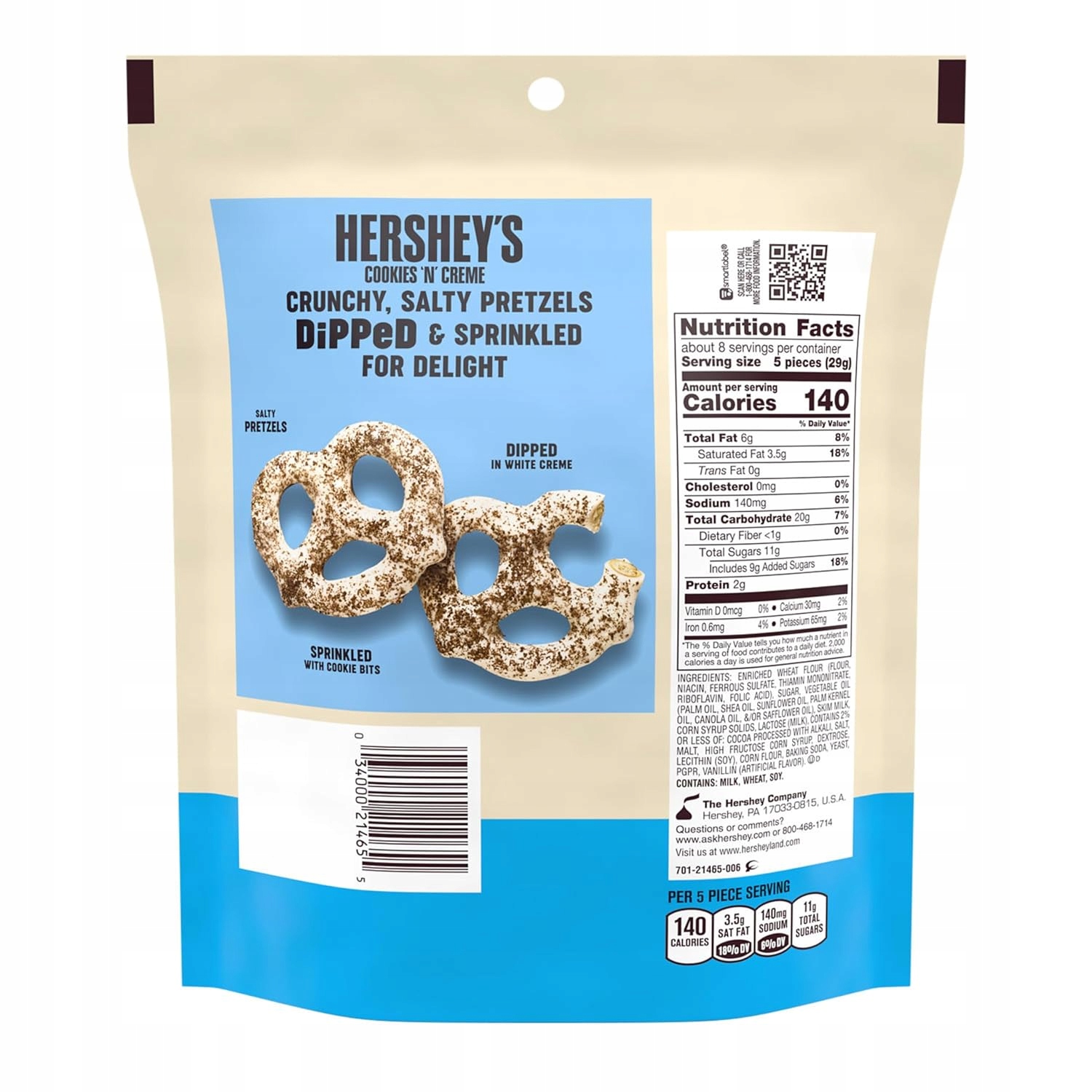 Precelki Hershey’s Cookies 'N’ Creme Dipped Pretzels to idealna przekąska na różne okazje – doskonale sprawdzą się podczas wieczornych seansów filmowych, jako przekąska na spotkaniach z przyjaciółmi lub słodka nagroda w ciągu dnia. Chrupiąca konsystencja precelków i gładka, ciasteczkowa powłoka z czekolady sprawiają, że Hershey’s Cookies 'N’ Creme Dipped Pretzels zaspokajają zarówno słodkie, jak i słone pragnienia, dostarczając intensywnych doznań smakowych.